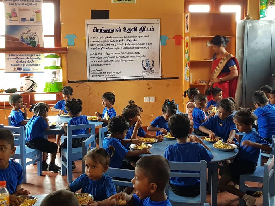 பிள்ளை நிலா முன்பள்ளியில் கல்வி பயிலும் 27 மாணவர்களிற்கும் 3ஆசிரியர்களிற்கும் இணைப்பாளரிற்கும்  சாரா எவலின் நிவேதிதன் (சுவிஸ்); தனது மாமனார் ராஜ்-விதுரன் இன் பிறந்த தினத்தினை முன்னிட்டு விது நம்பிக்கை நிதியத்தினூடாக மதிய போசனம் வழங்கினார்.